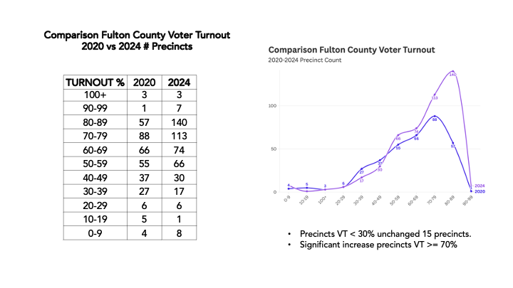 Of the 20 precincts regarded as the lowest voter precincts in metro Atlanta, 19 saw increased turnout in this year’s general election compared to 2020. That trend also showed itself in Fulton County, with more than 70 percent of all registered voters casting ballots, compared to about 65 percent in 2020, according to Georgia Secretary of State records.