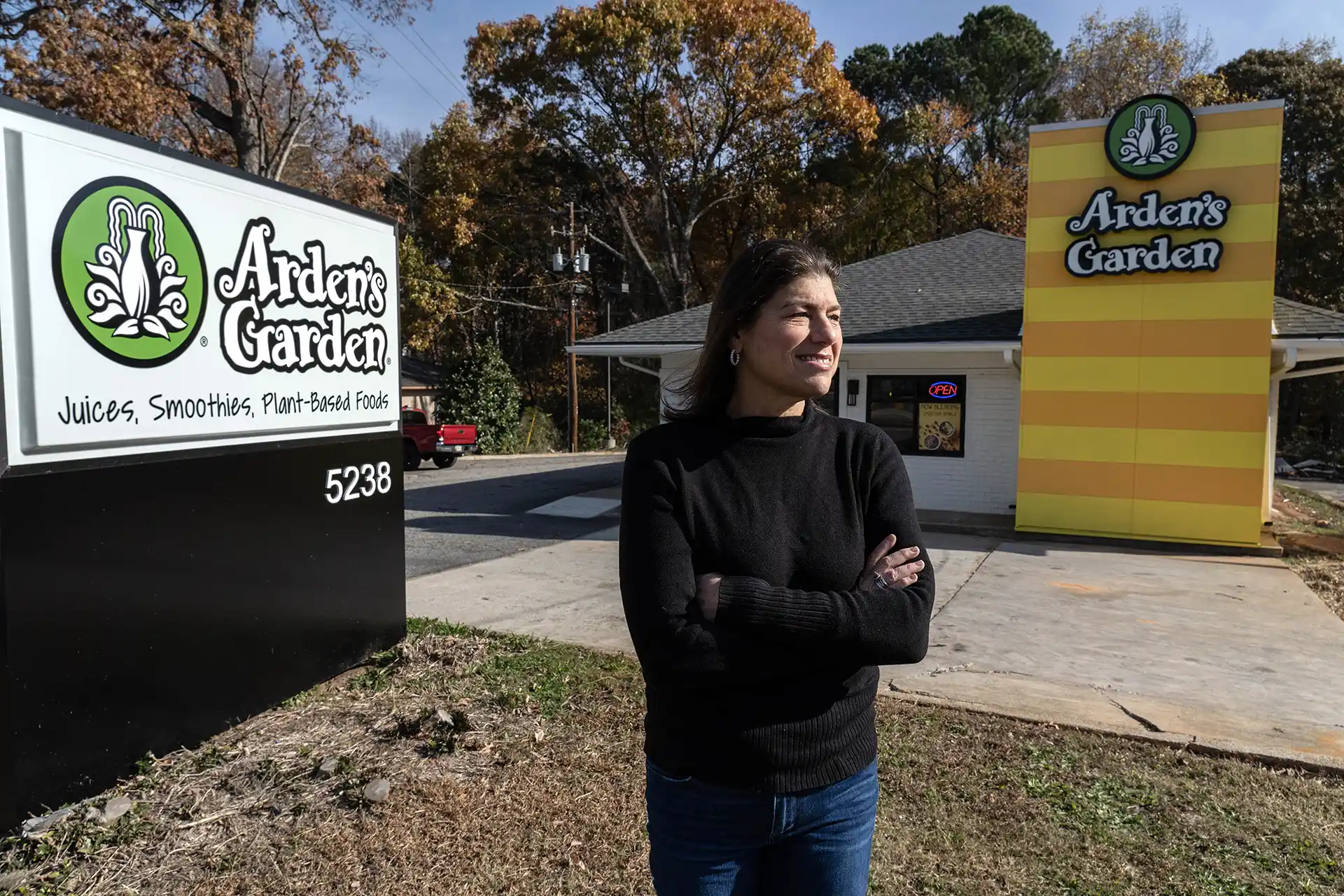 Arden’s Garden CEO Leslie Zinn stands in front of the smoothie and juice shop’s newest location on Old National Highway. Photo by Dean Hesse