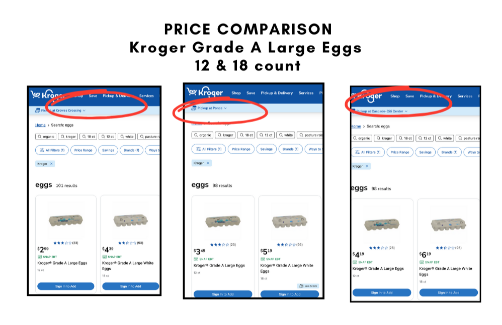To do your own price comparisons, search Kroger’s website for ‘eggs’ and change store pickup location.